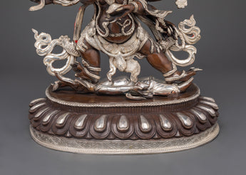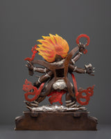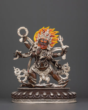 This magnificent statue of the Six-Armed Mahakala Buddha displays the extraordinary artistry of traditional Patan, Nepalese metalworkers. This statue, which is made of oxidized copper and has silver plating on it, combines old-world charm and durability. The statue's oxidized finish gives it an elegant, antique appearance, and the silver plating intensifies its celestial brilliance.