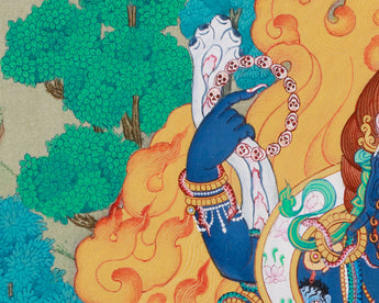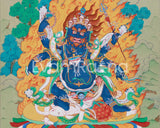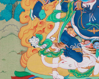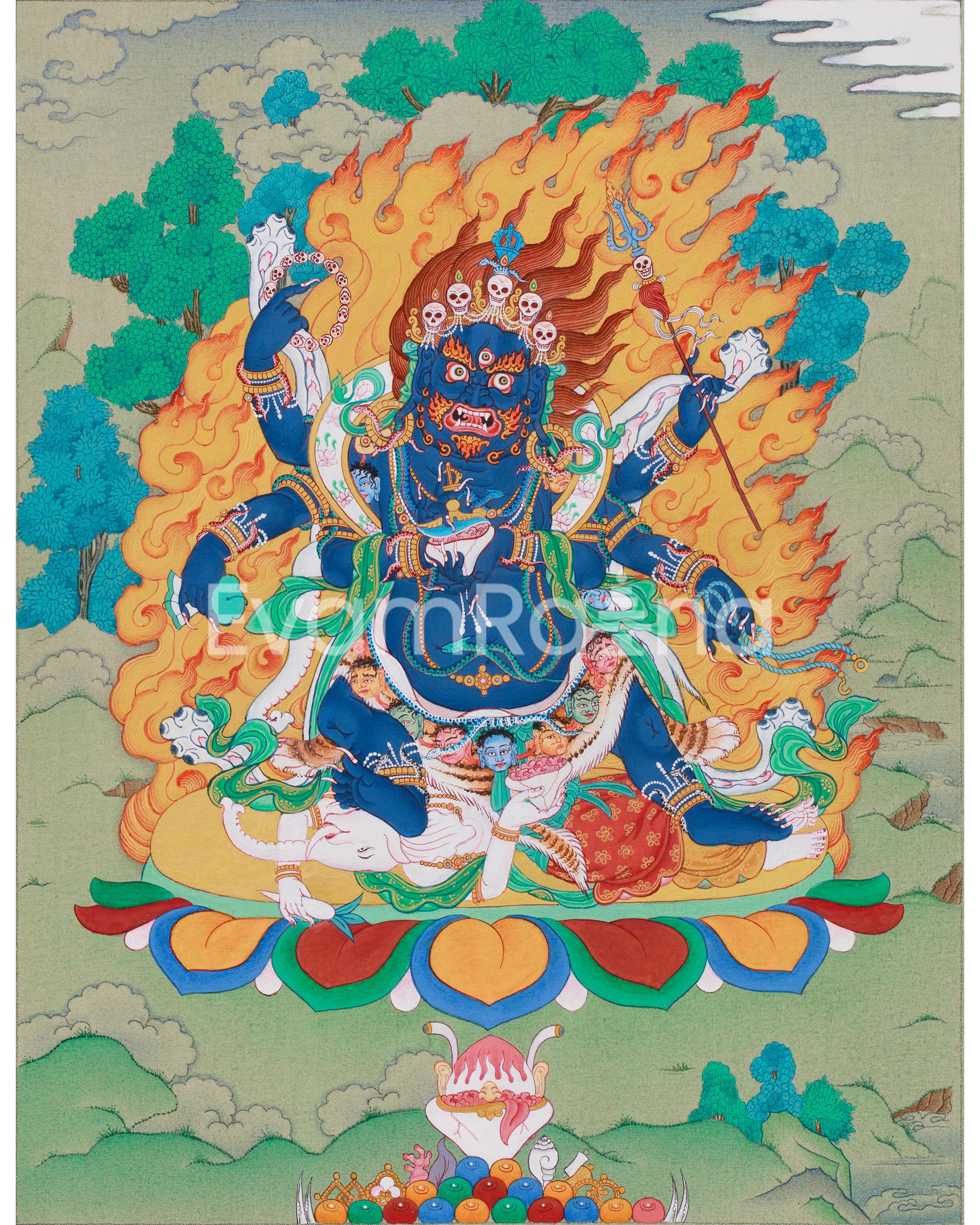 Six-Armed Mahakala, also known as "Nyingshuk" in Tibetan, is revered as a wrathful deity and a manifestation of Avalokiteshvara, the compassionate bodhisattva. Despite his alarming appearance, his primary responsibility is to protect the Dharma and its practitioners from spiritual and physical harm. Mahakala's six arms represent his promise to save sentient beings from suffering across the six realms of existence. His practices are particularly popular in Tibetan Buddhism due to their effectiveness in removing obstacles, attracting positive energies, and creating an environment conducive to spiritual practice.