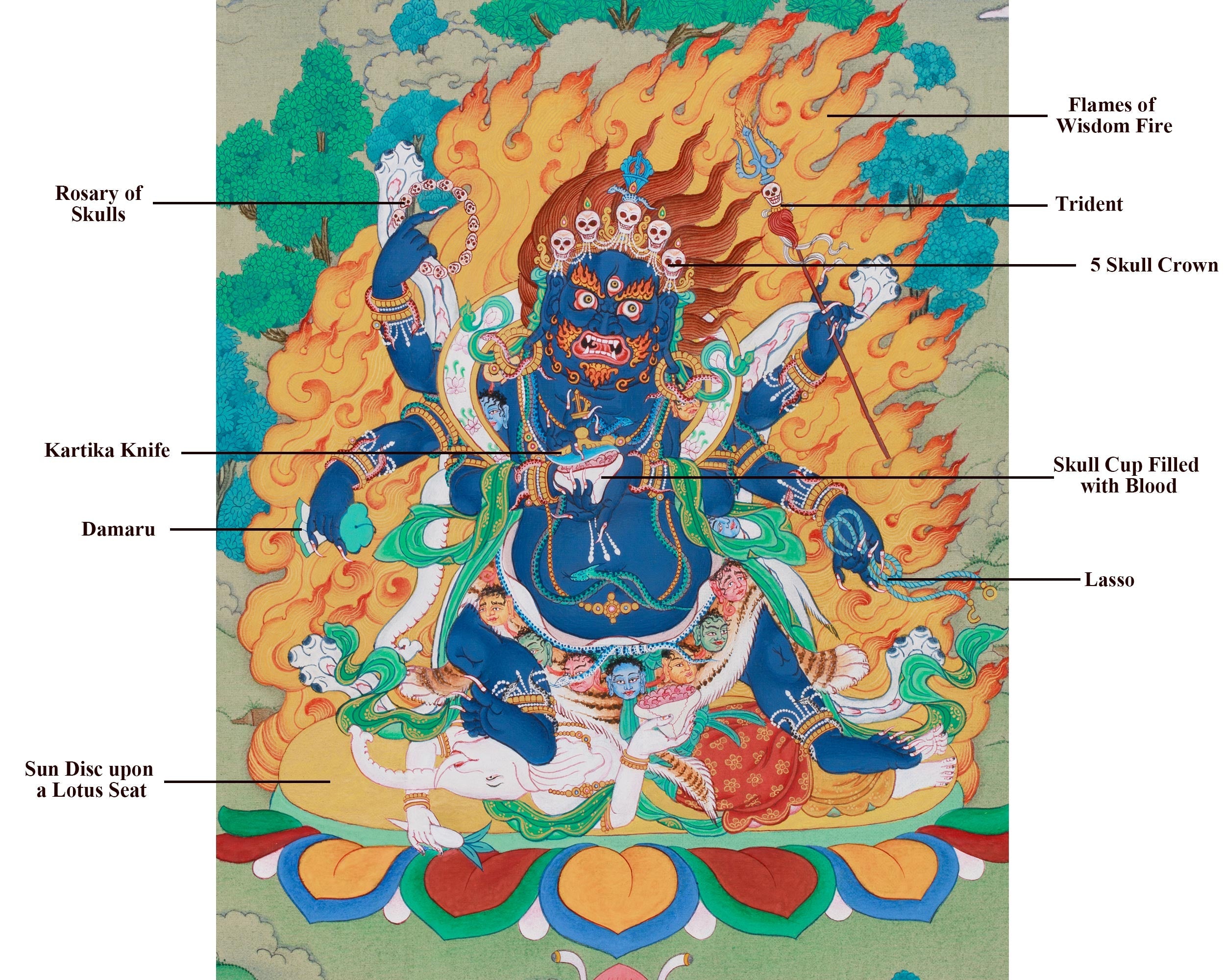In maintaining his protective role, Mahakala is portrayed with a wrathful expression. His six arms, each containing a distinct ritual tool, represent his capacity to simultaneously oppose evil forces coming from several directions. Each of these tools; a flaming sword, a trident, a skull cup that holds the elixir of life, a damaru (hand drum), a khatvanga (ritual staff), and a noose, represents each aspect of his transformational and protective abilities. A snake and skulls adorn his body, signifying his control over rebirth and death.