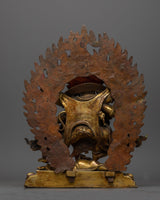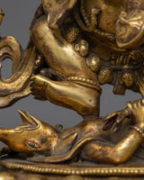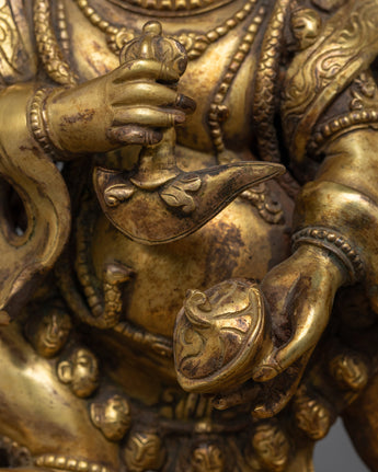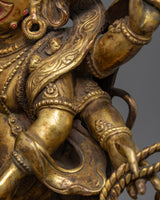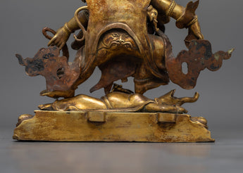 Discover the strength and protection of the six-arms mahakala antique touch statue, a powerful depiction that stands 34.5 cm tall. This statue, made of copper, is intricately detailed with 24K gold gilding and has an antique feel. It captures the ferocious soul of Mahakala. Each of his six arms, which hold various symbolic weapons, highlights his function as a spiritual warrior, while the complex gold and acrylic paintings highlight his formidable expression and dynamic posture.