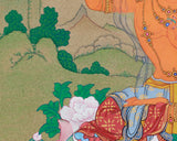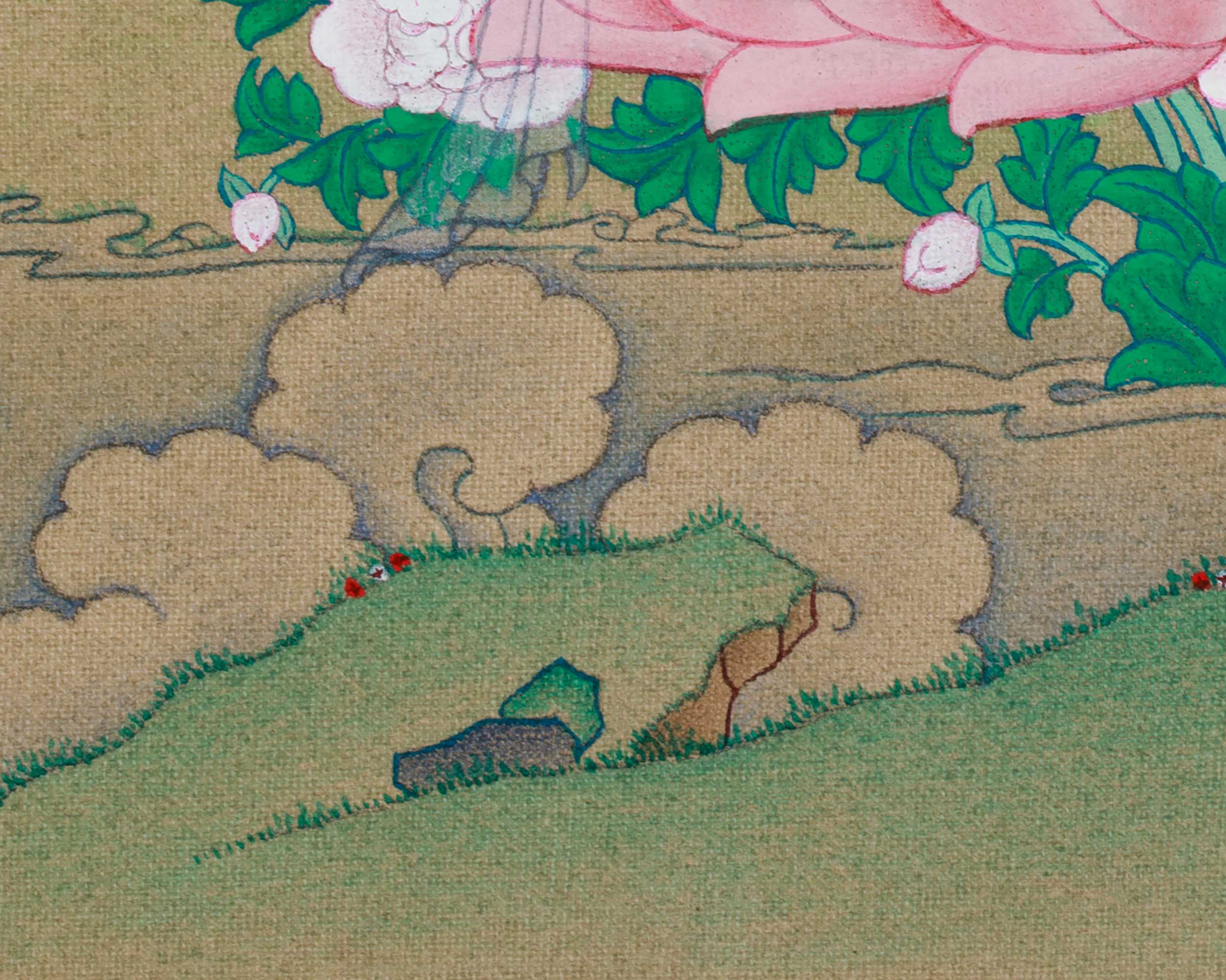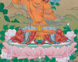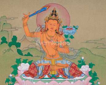 The 23 cm Manjushri Thangka, a hand-painted artwork, was created in our Enlightenment Studio. Made on fine cotton canvas with natural stone colors and genuine 24K gold, this thangka radiates both spiritual energy and artistic elegance. The mineral pigments provide vibrant, long-lasting color, while the gold detailing highlights Manjushri’s divine presence, symbolizing wisdom and insight. Executed in the traditional Karma Gadri style, known for its fine detailing, harmonious composition, and serene aesthetics, this artwork is a perfect blend of devotion, workmanship, and sacred symbolism.