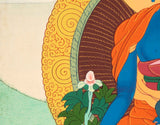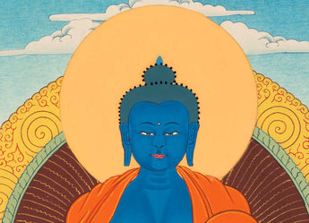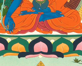 We have painted the Medicine Buddha shown in this thangka in lapis lazuli blue. The thangka's color scheme is nicely harmonized to provide calming enjoyment when viewed. He is holding a branch of myrobalan in his right hand. He has a lapis lazuli pindapatra on his lap with a bottle of medication in his left hand. The Buddha has long-lobbed ears, an ushnisha, an urna, and curly hair. The color blue, or lapis lazuli, on his body denotes that he accepts all the illnesses and maladies of the suffering beings.