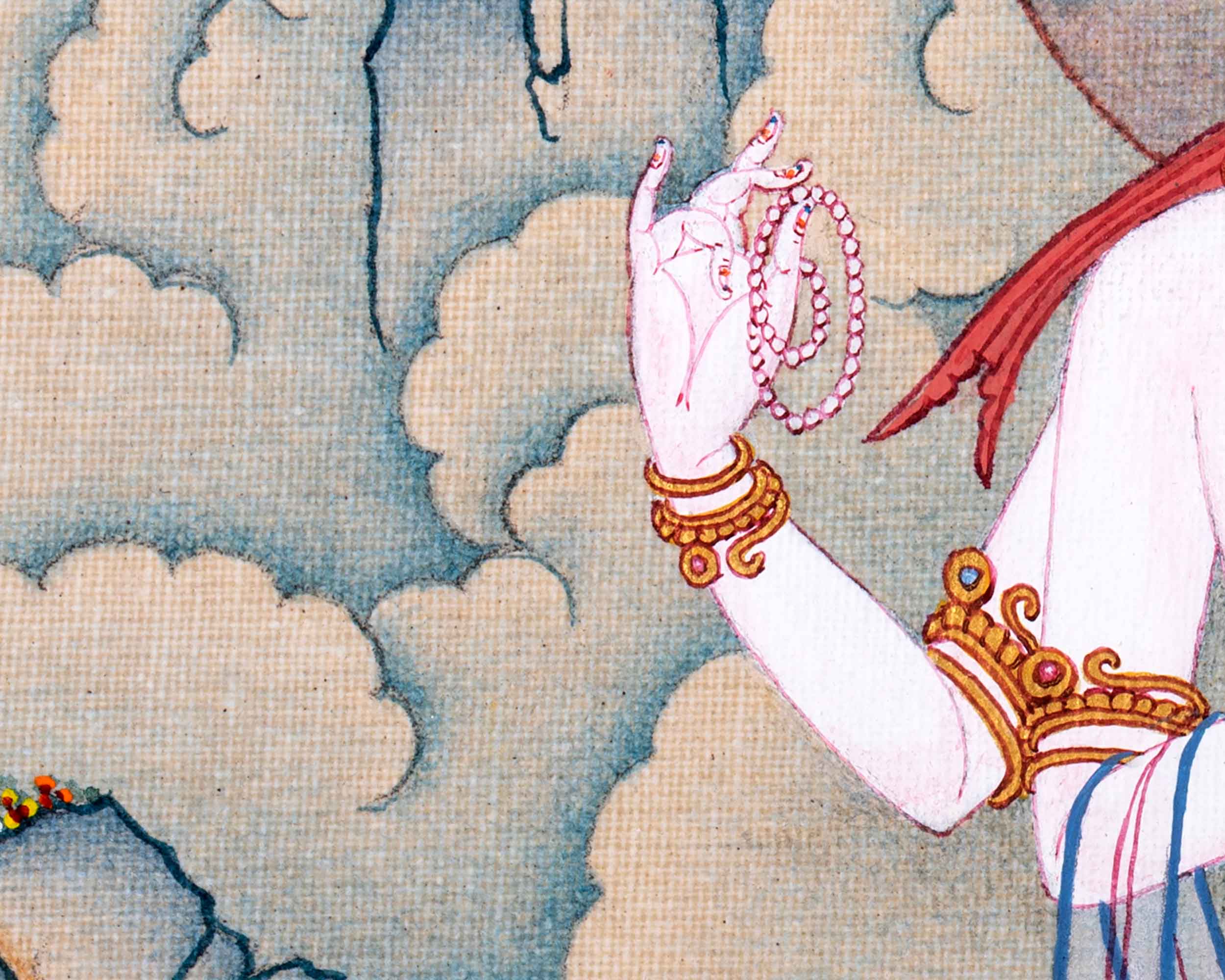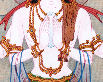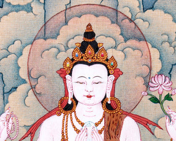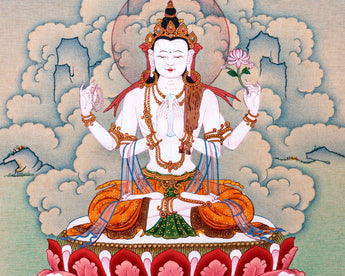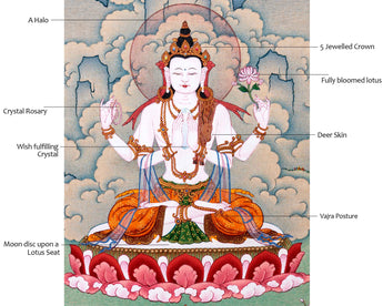 Chenrezig is the most respected Bodhisattva, embodying all Buddhas' compassion. He is also known as Avalokitesvara, or "One Who Looks With Unwavering Eye." In times of struggle and difficulty, he listens to the pleas of all sentient beings. His two front hands clasp in front of his jewel-draped heart in a religious gesture. He wears a crystal akshamala, or rosary, signifying the never-ending cycle on his upper right hand. His left hand is holding a white lotus, meaning that he frees aware beings from the muddy streams of anguish and hellish regions, leading them to greater levels of enlightenment. He's draped in silk and sits on a row of lotus petals, his legs in the "diamond position" of meditation.
