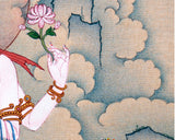 This small Chenrezig Buddhist art thangka was painted with natural stone colors and 24K gold by our artist (also known as Avalokiteshvara). He sits atop a moon disc lotus seat on the ground's surface with a calm and peaceful look.