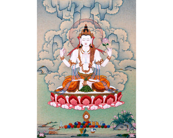 Note: Four-Armed Chenrezig Thangka is an original painting from Enlightenment Studio located at Boudha Stupa.