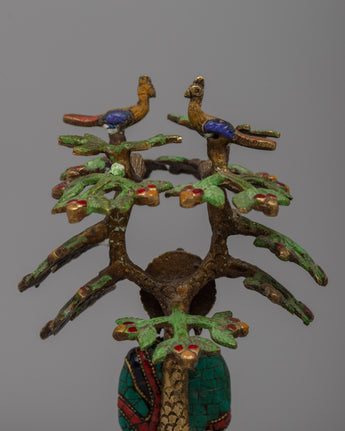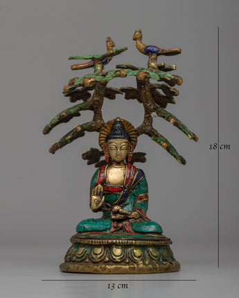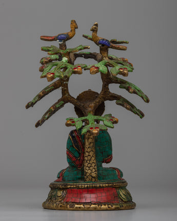 This piece is expertly made from brass and decorated with Artificial Stones coral and turquoise stones, which offer brilliant shades to its spiritual and decorative attraction. The Tree of Life branches have intricate carvings, featuring birds symbolizing freedom and transcendence. This statue, weighing 0.96kg, is both powerful and movable, making it suitable for altars, meditation spaces, or as an attractive present. This gorgeous representation of Amoghasiddhi Buddha will bring calm, strength, and spiritual serenity into your living space.
