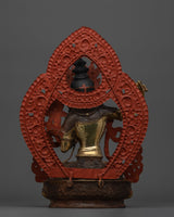 The Manjushri Statue "The Bodhisattva of Wisdom", stands at a height of 14.4 inches (36.5 cm) with a base width of 10.8 inches (27.5 cm), crafted with an oxidized copper body, this statue is enhanced with 24K gold gilding, offering a radiant finish. The intricate details are further highlighted by gold and acrylic paintings