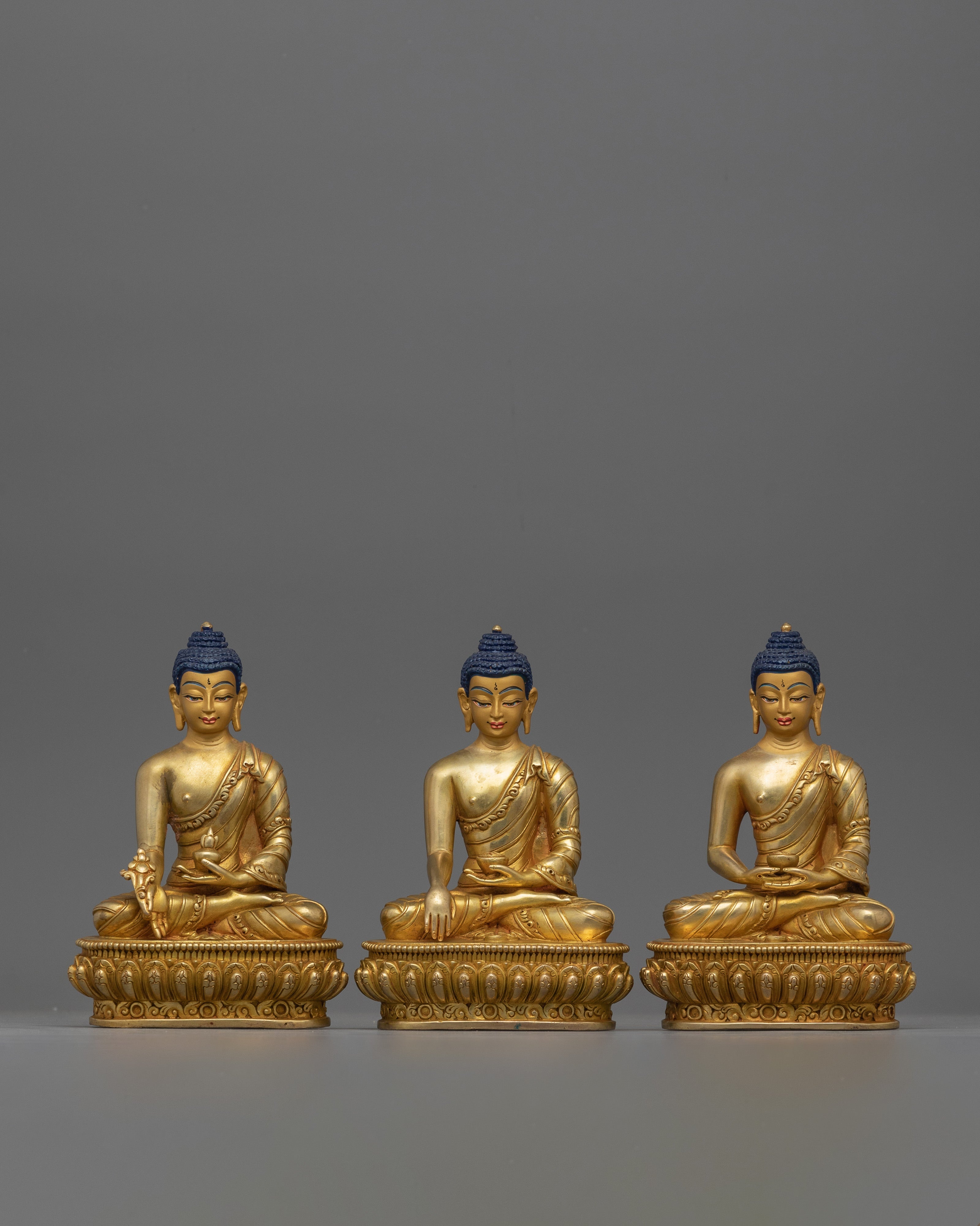 Handcrafted 24K Gold Gilded Copper Three Buddha Sacred Statue Set Symbolizing the Enlightened Buddha
