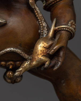 Black Dzambhala stands with a ferocious face, clutching a skullcup, indicating his capacity to lift poverty and bestow plentiful riches to those who seek his blessings. His protecting aura and loving heart combine to provide material and spiritual abundance while shielding believers from harmful influences and suffering.