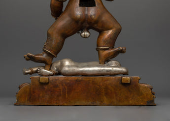 The Spiritual Black Dzambhala (Kubera) Statue is a beautiful symbol of wealth and protection, standing 20.5 inches (52 cm) tall with a base width of 16.1 inches (41 cm). Made from an oxidized copper body, it is decorated with gold plated and silver plating, giving it a striking appearance. The statue is further enhanced with colorful acrylic paintings, adding life and detail to the design.