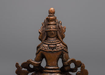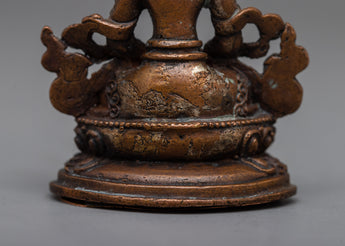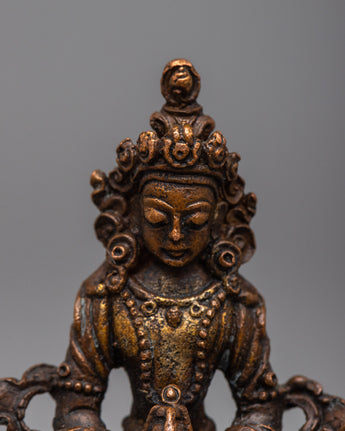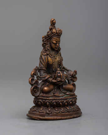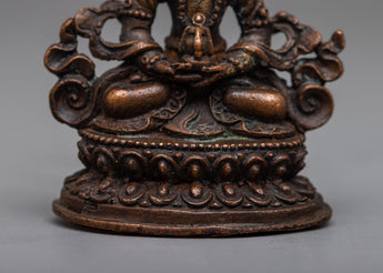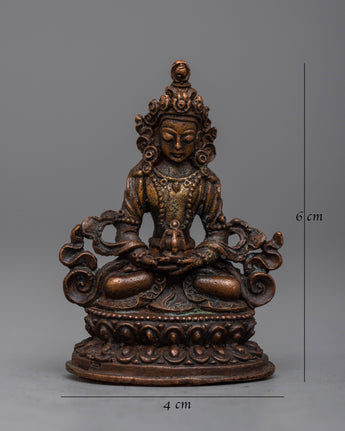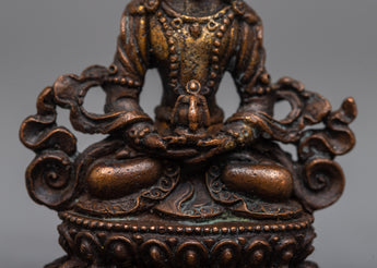 Presenting our machine-made Buda Amitayus statue, which is only 6 cm tall. This statue, which was meticulously created on oxidized copper, captures the spirit of the venerated Buddha of Boundless Life. Even with its diminutive size, every detail is carefully reproduced to guarantee affordability and accuracy. This statue, which looks great in small areas or as a component of a larger collection, is a peaceful reminder of the fleeting nature of life and the quest for spiritual satisfaction.