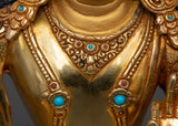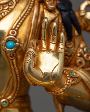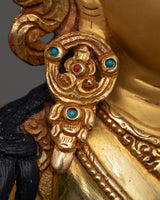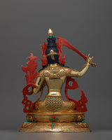 The Manjughosa Statue (Manjushri) is a work of art, standing 12.2 inches (31 cm) tall with a base width of 9.1 inches (23 cm). Crafted with a copper body adorned with 24K gold gilding, enhancing its spiritual appeal. The details are highlighted with gold and acrylic paintings, showcasing the artisan's dedication to fine craftsmanship. Hand-carved gemstones further embellish the statue, adding vibrant and symbolic depth.