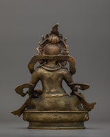 This Dharma Protector and Wealth Deity Dzambhala Sculpture, stands at a height of 9.1 inches (23 cm) with a base width of 7.5 inches (19 cm), making it a striking addition to any altar or meditation space. Crafted from copper, the statue features an antique finish, giving it an aged, timeless appearance.