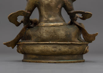 Dzambhala is shown in a sitting position, holding a mongoose in his left hand to represent the removal of material and spiritual impediments, while his right-hand rests in a gesture of giving. His crown symbolizes the prosperity and plenty he bestows to his disciples. Dzambhala's strong yet sympathetic visage reminds practitioners of his protective nature and capacity to alleviate poverty by providing spiritual and practical gifts.