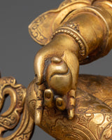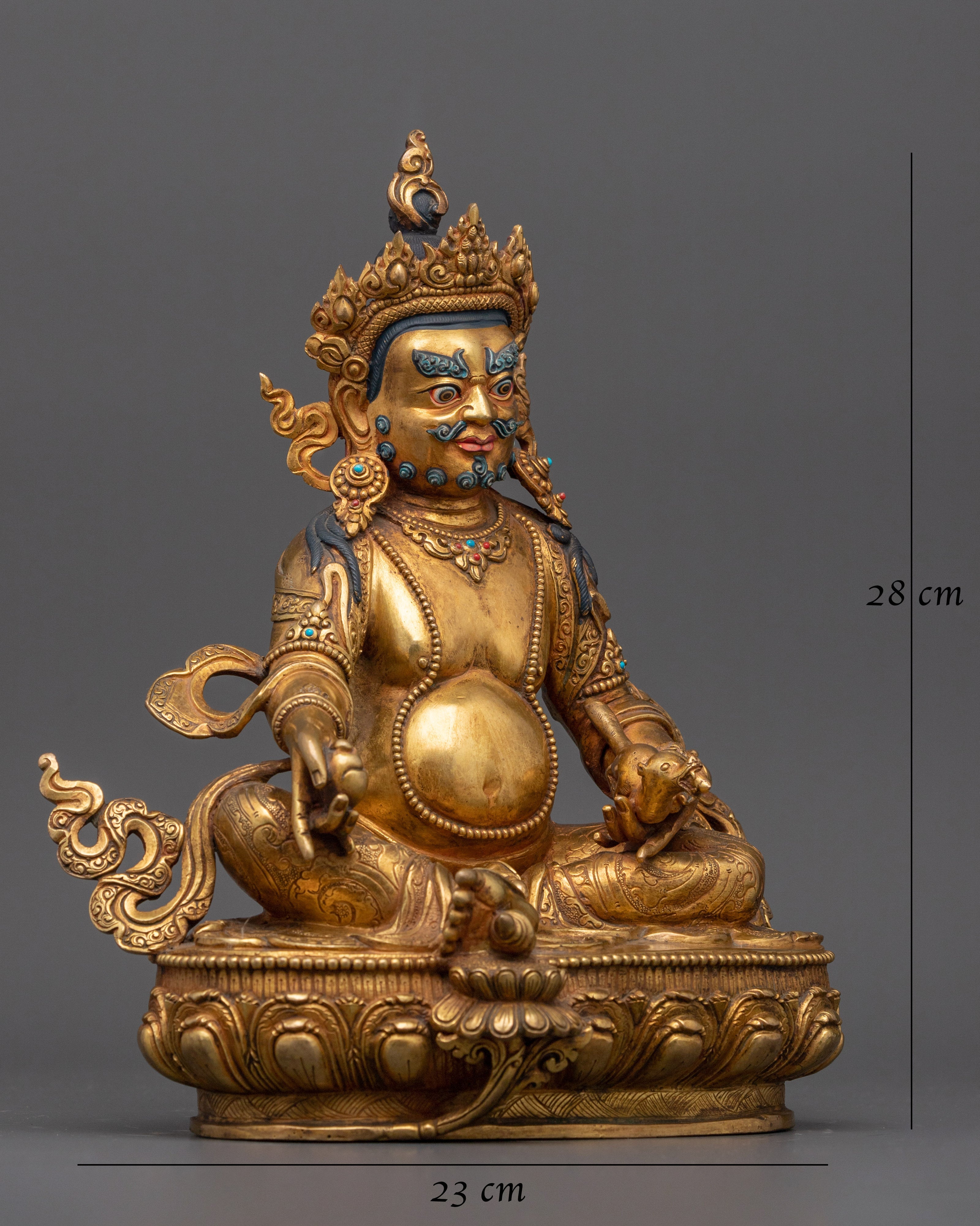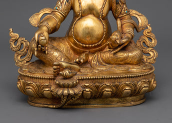 With the magnificent Spiritual Dzambhala Sculpture, you may deepen your spiritual practice and attract riches. This finely wrought figure has accents of 24K gold and is composed of gilded copper. In our studio, we have a handmade Buddhist wealth deity of the Gold Dzambhala Statue in traditional Himalayan art of Nepal. We have sculpted sacred deities of Buddhism for generations and always adhere to their authentic iconography while depicting them in the statue. Dzamabhala, also known as Kubera in Sanskrit, is sitting on the moon disc of the Lotus seat with a wrathful expression. He holds a mongoose in one hand and citron fruit in the other.