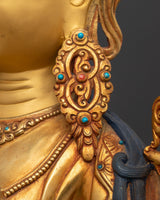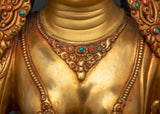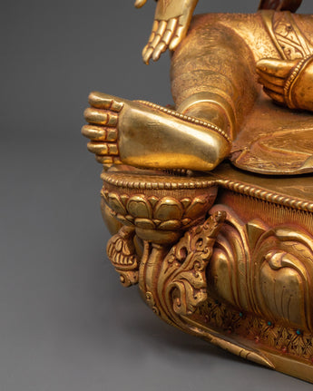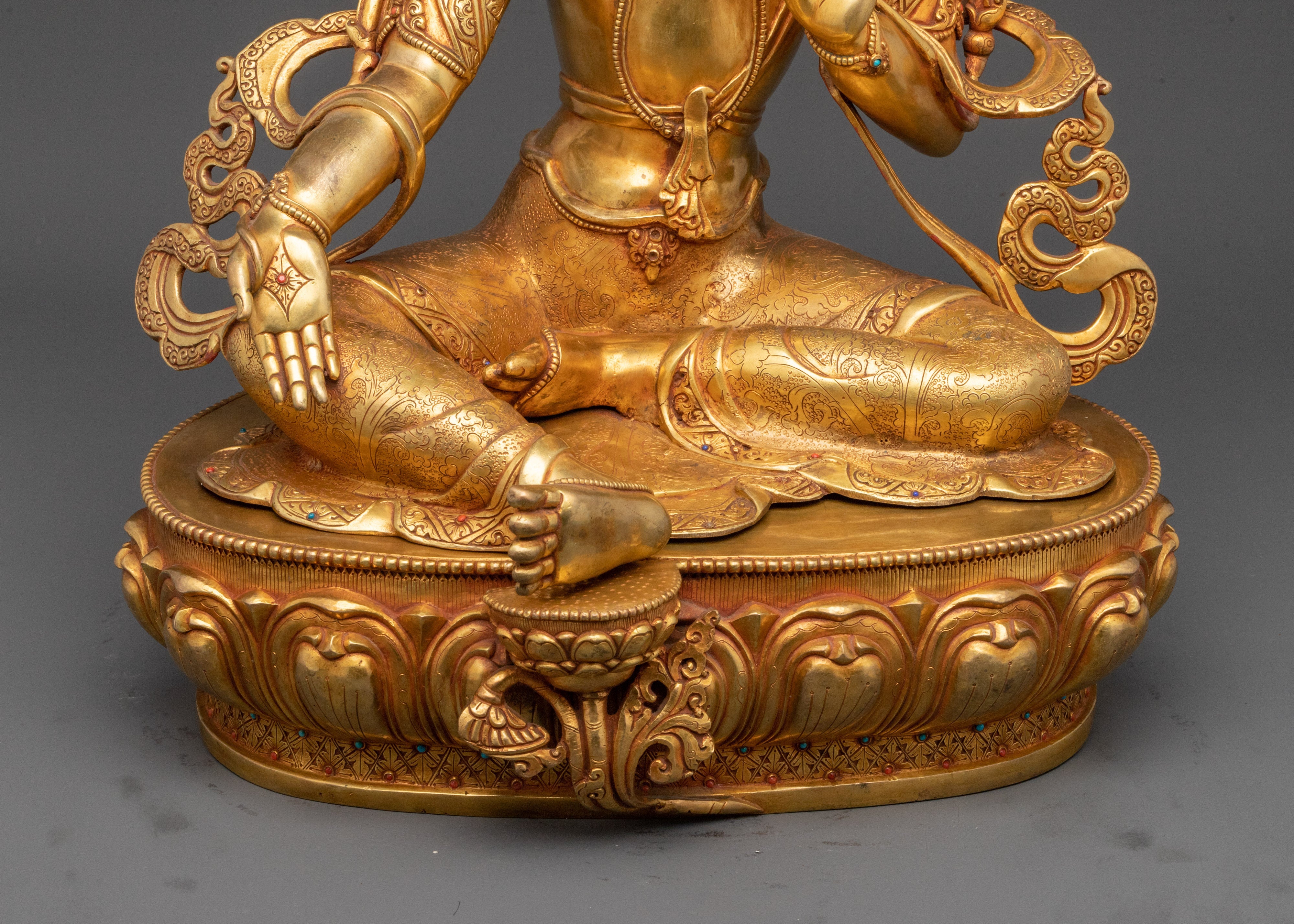 The exquisite figurine has been skillfully produced by proficient artisans in Patan, Nepal, a city widely recognized for its remarkable artistry and workmanship. The statue exudes a divine and eternal beauty, with a solid copper body generously plated in 24K gold. The detailed paintings in gold and acrylic highlight the subtle nuances of Green Tara's calm expression, elegant stance, and the vivid lotus foundation she is seated. The figurine is further enhanced with hand-set jewels, which give its rich, symbolic features—which stand for her protection and enlightened nature—more color and depth.