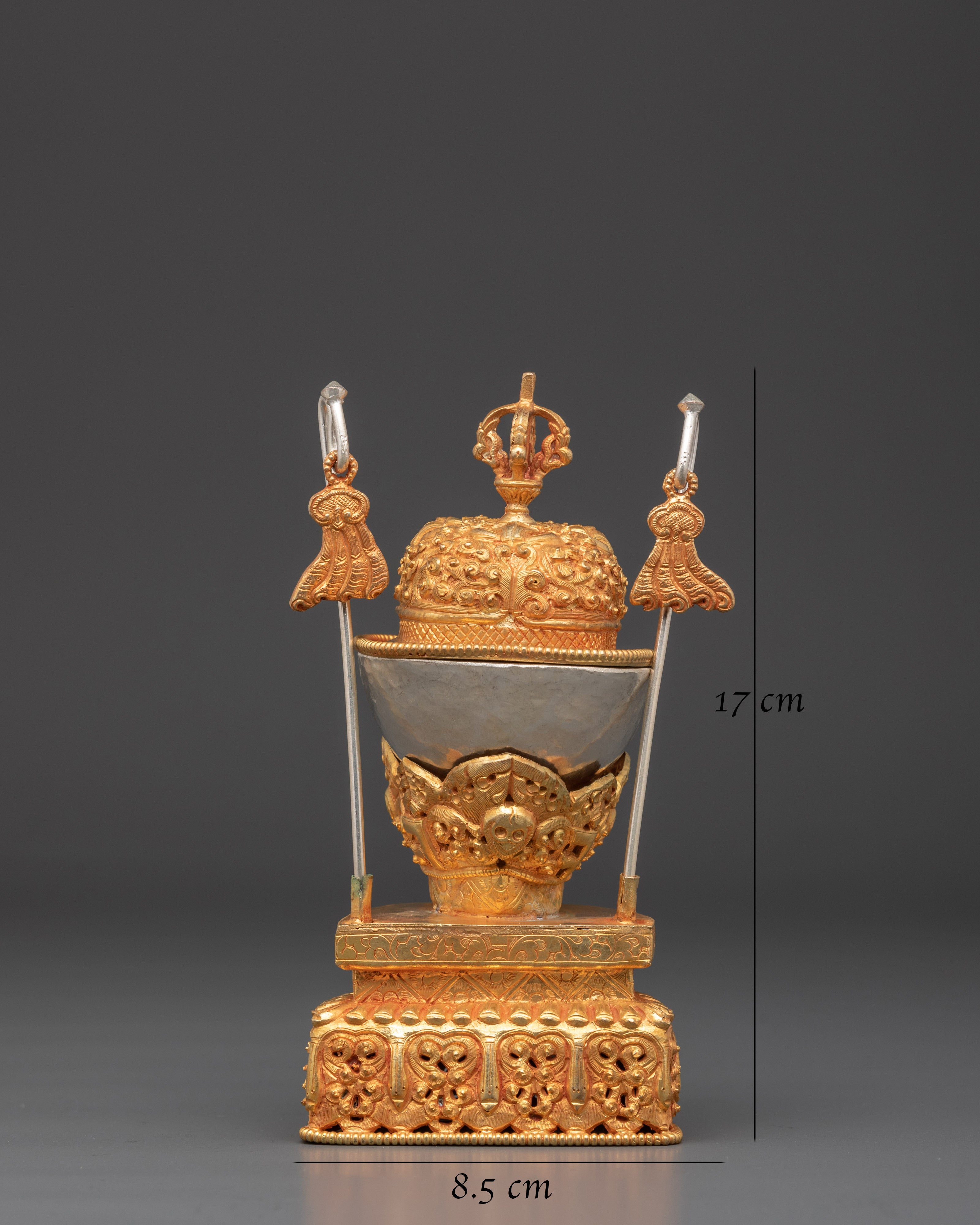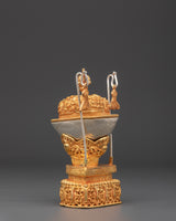 This beautiful Kapala, measuring 17 cm in height and 8.5 cm in width, and weighing 0.31 kg, is carefully designed for both aesthetic beauty and spiritual significance. The lid features finely detailed engravings, flanked by two ritual silk banners, and crowned by a miniature Vajra symbolizing spiritual power. Crafted with devotion by skilled artisans, this sacred vessel channels protective and transformative energies, making it ideal for high-level offerings, visualization practices, or to enhance the sanctity of your sacred space.