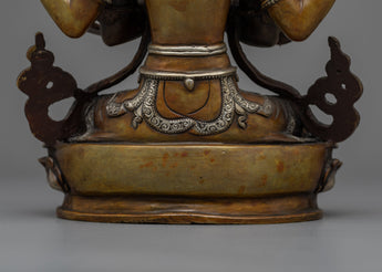 Introducing our Spiritual Handmade Statue of Chenrezig, a beautifully crafted piece Rising 10 inches tall with a base measuring 7 inches. Weighing 2.42 kg, this statue is made from high-quality oxidized copper, adorned with silver plating and detailed gold and acrylic paintings, showcasing the Excellent artistry of Nepalese craftsmanship. Handcrafted by skilled artisans in Patan, Nepal, a city renowned for its exceptional metalwork, this statue reflects traditional Buddhist art's rich heritage and devotion.