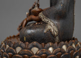 The Spiritual Healing Medicine Buddha is a powerful symbol of health, healing, and compassionate care. This statue weighs 3.77 kg and stands 11.8"/30cm (Height) with a base width of 9.6"/24.5cm, making it a centerpiece for any religious place. The statue is made of oxidized copper, and adorned with gold and acrylic paints. The silver plating adds a touch of elegance, enhancing the figure's spiritual presence. This calm representation of the Medicine Buddha is designed to provide serenity, healing, and protection to those in need, both physically and spiritually.