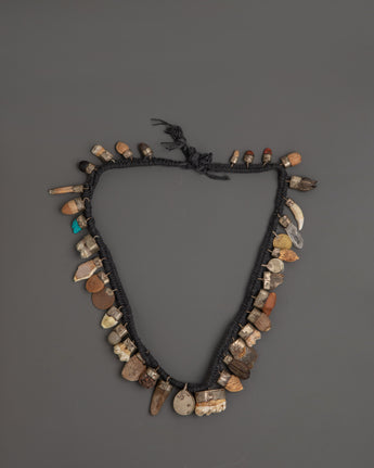 This Spiritual Mala with 32 Elements is an extremely effective instrument for meditation, spiritual rituals, and personal introspection. These one-of-a-kind mala beads, which measure 41cm in length and weigh 0.20kg, are made from a combination of sacred items such as semi-precious stones, bones, teeth, and seeds. The 32 various elements employed in the construction of this mala represent a strong connection to old traditions and are ideal for individuals seeking spiritual harmony and tranquility. Whether you use it for prayer, meditation, or as a significant spiritual accessory, this mala will improve your practice.
