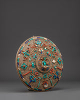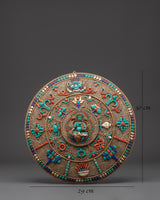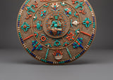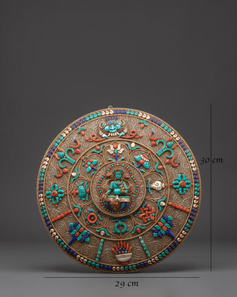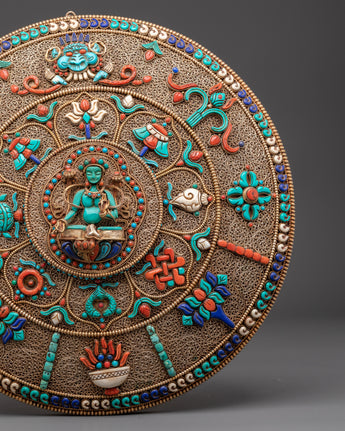 This spiritual wall art, created to encourage peace and strengthen your meditation practice, mixes traditional symbols with refined craftsmanship. Lapis lazuli is renowned for promoting self-awareness and mental clarity, whilst turquoise is valued for its healing and protective properties.  Coral offers vivid energy, representing life force and rejuvenation. Together, these stones create a serene aura in your home, elevating this wall hanging beyond mere decor to a sacred instrument for spiritual growth and mindfulness. The combination of metals and the vibrant colors of the stones produces a stunning contrast that boosts the aesthetics of any space.