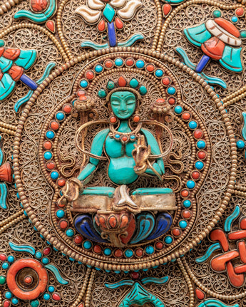 This wonderfully handcrafted Spiritual Meditation Wall Hanging will add a profound sense of tranquility and spiritual elegance to your space. This fantastic artwork, measuring 30cm in height and 29cm in width, makes an excellent focal point for meditation rooms, yoga studios, spiritual sanctuaries, or any other location dedicated to mindfulness and inner peace. This wall hanging, crafted from copper, silver, and gold plating, is adorned with genuine natural stones, including lapis lazuli, turquoise, and coral, each carefully selected for its spiritual significance and energetic properties.