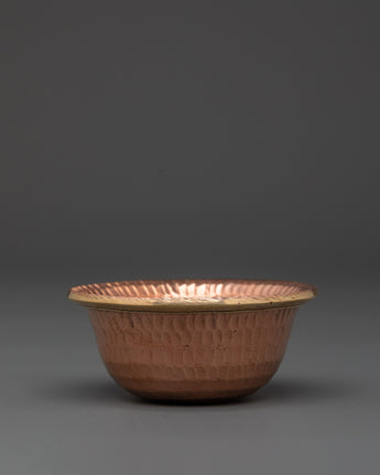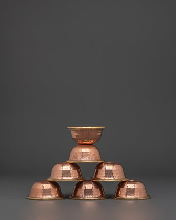 Crafted from copper, these bowls are used to symbolize the seven offerings: water for drinking, water for washing, flowers, incense, light, perfume, and food. Used during puja, meditation, or spiritual practice, this set helps cultivate generosity, purify karma, and deepen devotional focus. Whether for personal use or temple display, this offering set enhances any sacred space with purpose and authenticity.
