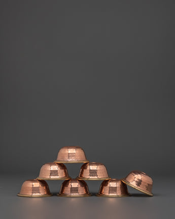 This Spiritual Offering Set features seven beautifully handcrafted copper water bowls, traditionally used in Tibetan Buddhist altar offerings. Each bowl measures 3.5cm in height, 8cm in diameter, with a 5.5cm base and 3cm inner depth. Weighing 0.090 kg each and totaling 0.66 kg, this set is lightweight yet substantial—ideal for daily rituals or shrine display.