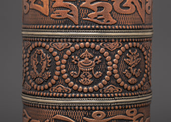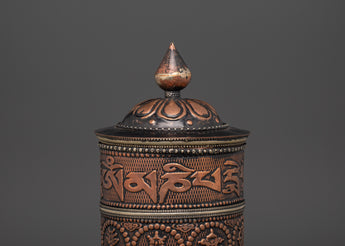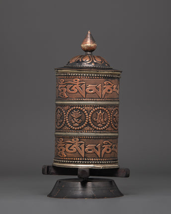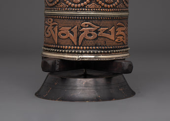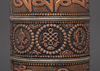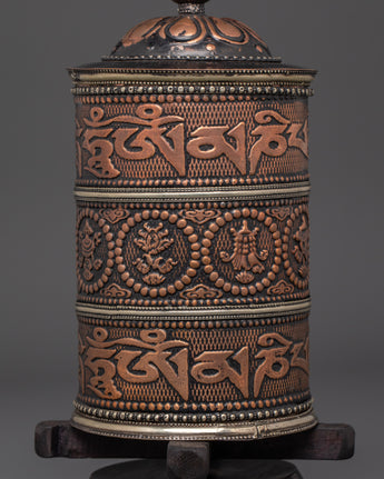 Practitioners utilize this handheld prayer wheel to intensify their prayers and wishes. It is claimed that spinning the wheel releases spiritual blessings, purifies negative karma, and cultivates compassion and knowledge. The smooth spin and balanced weight make it ideal for use during meditation, prayer, or ritual rites. The use of copper and brass enhances its aesthetic appeal while amplifying its spiritual significance.