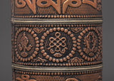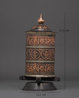 The Spiritual Prayer Wheel is a traditional Tibetan Buddhist object used for meditation and spiritual practice. This prayer wheel measures 27.5cm in height, 12.5cm in width, and weighs 0.53kg. It is crafted from copper and brass embellishments, reflecting the traditional craftsmanship of the Himalayas. It holds strong symbolic value, reflecting the constant flow of positive energy and blessings through the repetition of mantras engraved or written within it.