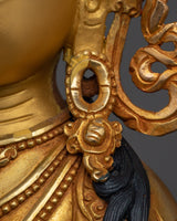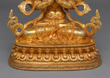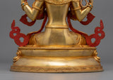 Handcrafted Spiritual Protector Chenresig, a Buddhist Deity, first provides infinite compassion to guide your spiritual path and enhance your soul. This Chenresig Statue, measuring 13.4 inches tall with a 9.6-inch base width and weighing 3.94 kg, depicts the Bodhisattva of Compassion, Avalokiteshvara. The enlightened deity represents the infinite compassion and kindness that guide sentient beings to freedom. This statue radiates calm and spiritual grace, featuring a copper body plated in 24K gold and intricate details of gold and acrylic paints on the face.