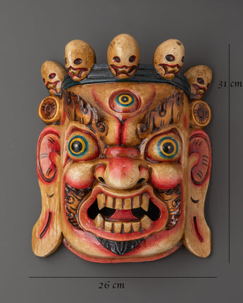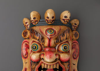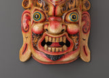 This Spiritual Protector Mask Wall Hanging, expertly hand-carved from wood and painted in rich acrylic hues, will bring the powerful presence of old Himalayan creativity into your house. This remarkable mask, measuring 31cm in height and 26cm in breadth, and weighing 0.72kg, is a sacred symbol of protection, believed to ward off evil energy and promote spiritual peace. Its striking design, expressive features, and symbolic crown make it a distinctive addition to any meditation area, yoga studio, or spiritual home shrine.