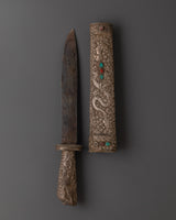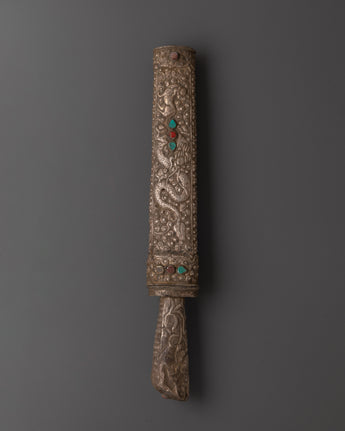 The silver-plated handle adds an elegant touch, enhancing its cultural and spiritual significance. This knife is typically used in various Buddhist rituals, including purification ceremonies and sacred offerings, making it a meaningful addition to any altar or spiritual space. Whether you are looking to enhance your meditation practice or seeking a traditional tool for sacred rites, this knife embodies the balance of beauty, power, and spiritual protection.