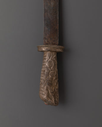 This Spiritual Ritual Knife is a finely crafted ceremonial blade, measuring 40.5cm in height and 7cm in width, with a weight of 0.75kg. The knife features an iron blade, complemented by a silver-plated handle, making it both a functional ritual tool and a beautiful piece of spiritual art. Traditionally used in Tibetan Buddhist ceremonies, this knife symbolizes the cutting of obstacles, the release of negative energies, and the invocation of spiritual power during meditation and ritual practices.