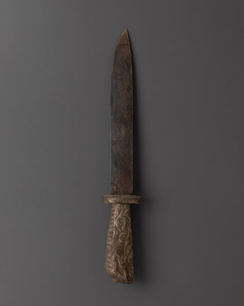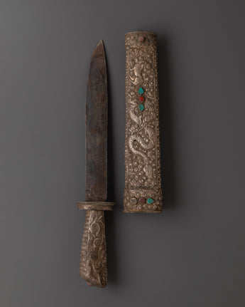 In Tibetan traditions, a Tibetan knife, also called a "phurba" or "kila," has cultural and symbolic meaning. The unique three-sided blade of this ceremonial dagger represents the victory over ignorance, desire, and aversion in Buddhism. Tibetan knives, which are adorned with elaborate carvings and frequently have a tripartite handle that represents different gods, are an essential part of religious rites, ceremonies, and spiritual practices. In addition to their spiritual significance, these knives might have practical uses in daily life, exhibiting in Tibetan communities a combination of deep cultural symbolism and usefulness.