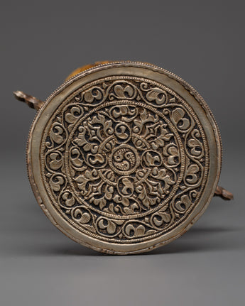 The designs engraved on the stamp are traditional Himalayan iconography, which is frequently employed in Tibetan rituals to promote protection, clarity, and spiritual awakening. Each curve and line is sacred, thought to channel benefits when pushed against ceremonial ingredients or sacrifices. This piece, which combines the bright tone of white metal with the textured integrity of fiber, is both a religio