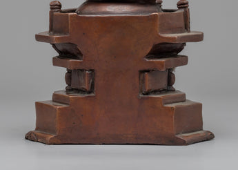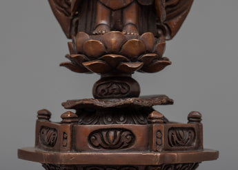 Delicately handcrafted in our workshop, the traditional standing Buddha statue is intricately designed with unique Nepali motifs. This piece is hand-carved out of premium oxidized copper, giving it an element of antiquity. The statue is full of intricate details, from the folds of his robe to the elaborate patterns on the pedestal. Here, the Buddha is depicted standing atop a lotus base that is upon a pedestal. He can be seen portraying the "varada mudra," a gesture of charity and compassion, and "abhaya mudra," a gesture of fearlessness and benevolence, with his left and right hand, respectively. We used a hammer and chisels to carefully carve each motif over many months. We can guarantee that the statue was made using only the best materials and will last for a very long time.