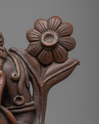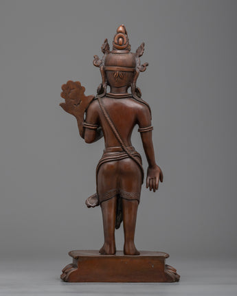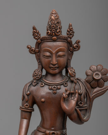 Behold the Standing Chenrezig Statue's mesmerizing beauty in the realm of divine artistry. This masterpiece, which was meticulously crafted on an oxidized copper body, captures the timeless grace and elegance of Chenrezig, the personification of compassion. Each exquisite detail of this revered deity, which stands tall atop a magnificent lotus base, perfectly captures its spiritual essence. The statue's oxidized finish gives it a mystical quality that conveys a sense of depth and antiquity. Allow Chenrezig's compassionate energy to permeate your being as you admire this beautiful creation, igniting a flame of compassion and love inside of you.