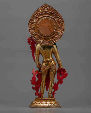 Avalokiteshvara, also known as Chenrezig in Tibetan, represents all Buddhas' compassion. He hears sentient beings' pleas and strives hard to help them navigate the trials of existence. This statue depicts Chenrezig in a standing position, reflecting his ever-ready stance to help those in need.