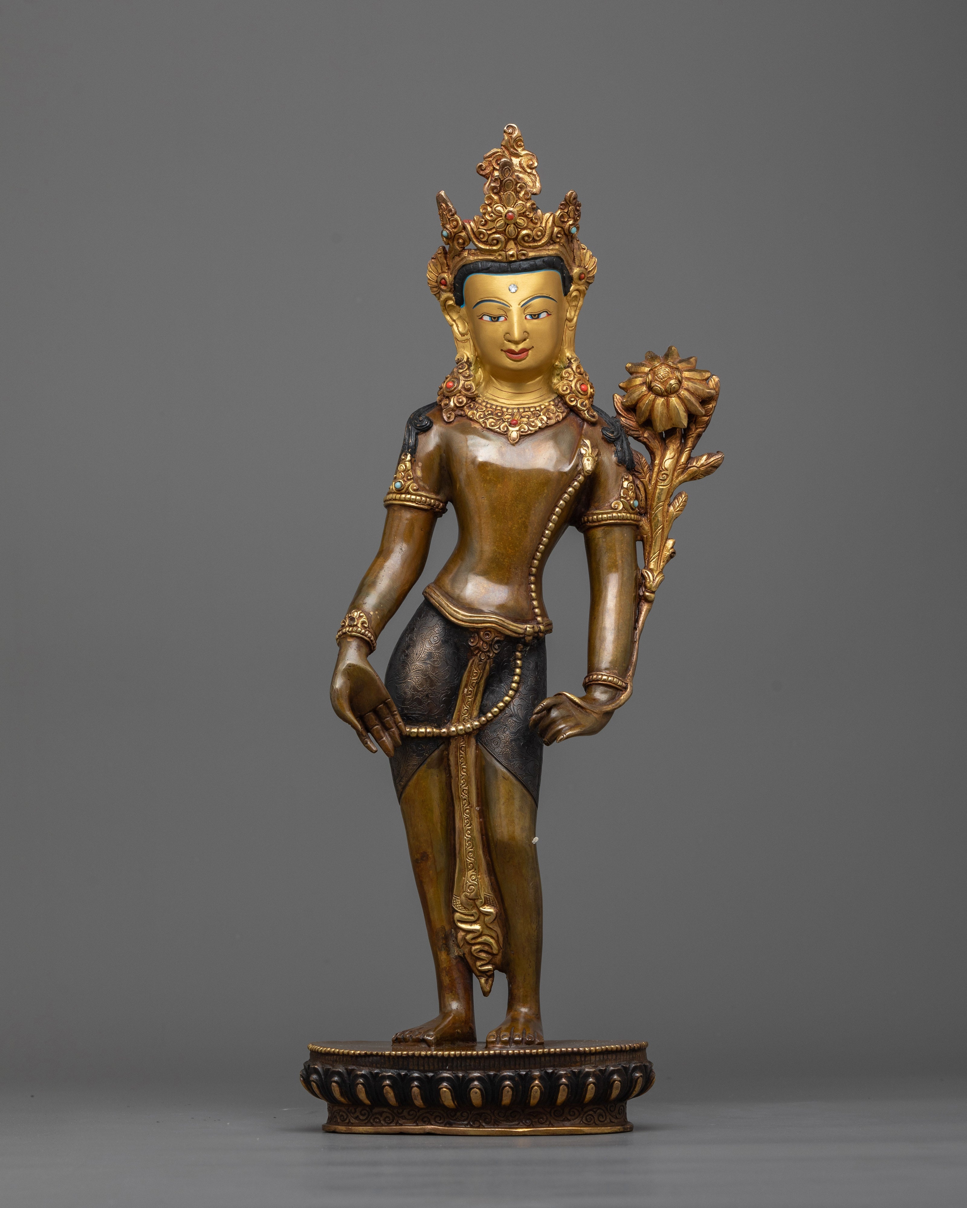 Avalokiteshvara, also known as Chenrezig in Tibetan, represents all Buddhas' compassion. He hears sentient beings' pleas and strives hard to help them navigate the trials of existence. This statue depicts Chenrezig in a standing position, reflecting his ever-ready stance to help those in need.