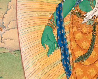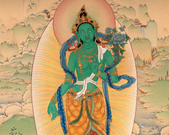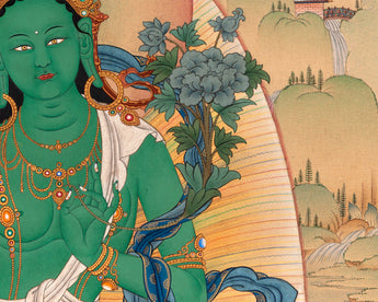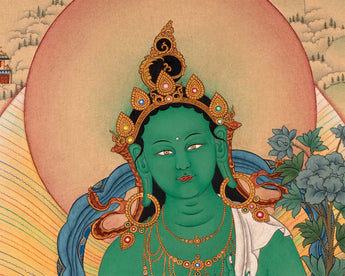 At Enlightenment, we have done the following Buddhist text and iconography detail. This Green Tara thangka is perfect for your Tara practice.