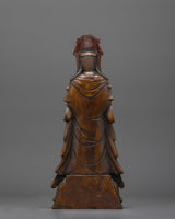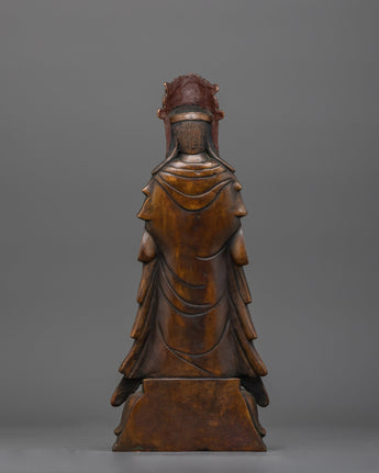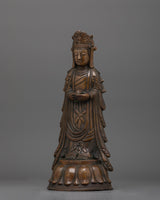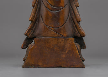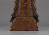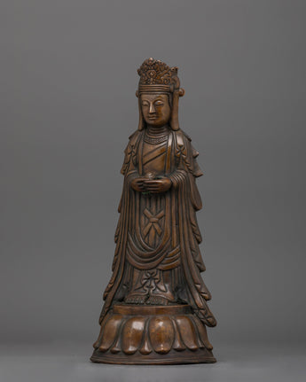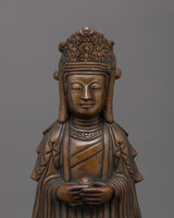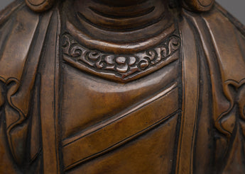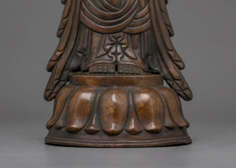 Standing Kshitigarbha Sculpture is made of oxidized copper, giving it a timeless, ancient aspect that emphasizes its spiritual value. The statue's characteristics, from Kshitigarbha's tranquil look to the flowing robes, are executed with outstanding skill, making it a focal point in any holy area or home shrine.