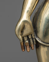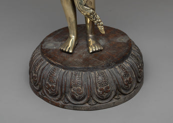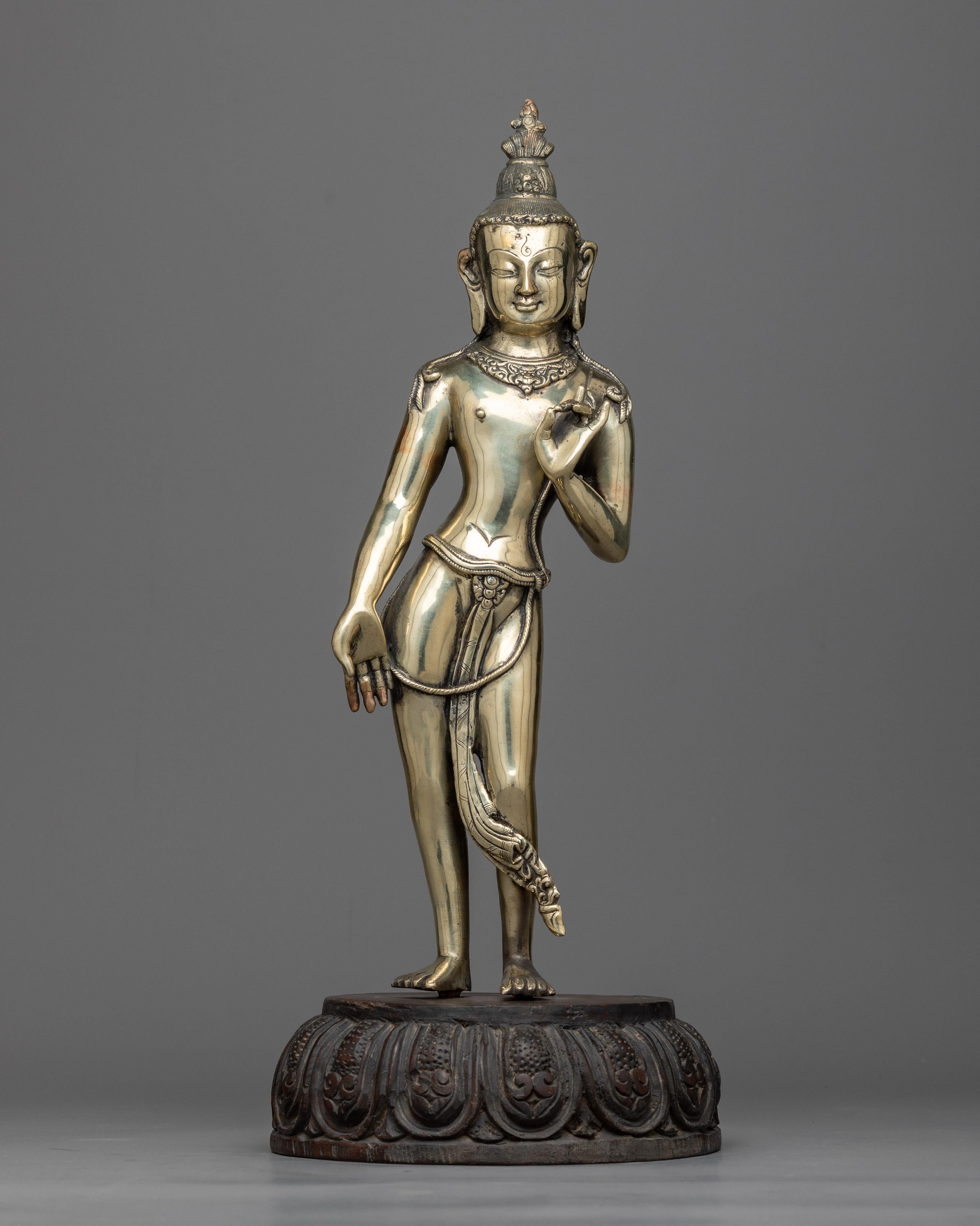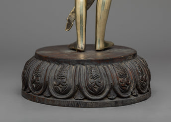 The statue is beautifully fashioned from copper, a material noted for its durability and spiritual resonance. It is delicately plated in silver, giving the sculpture a sense of grace and brilliance. The use of different materials shows the intricacies of Padmapani's body, from his tranquil demeanor to the beautiful folds of his robes. The wooden lotus base adds an element of earthiness and symbolizes purity and spiritual awakening.