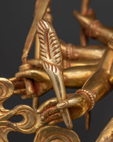 This majestic standing Rakta Ganesh statue stands at 21.3 inches tall, exuding a commanding presence. His radiant golden body, highlighted with intricate gold and acrylic paintings, embodies energy and dynamism, while the 24K gold gilding adds a sacred and luminous glow to the piece. Ganesh is depicted in a standing posture, ready to remove obstacles and bring forth prosperity and success, with multiple hands holding symbolic items such as a vajra and an axe, representing his ability to cut through difficulties.
