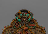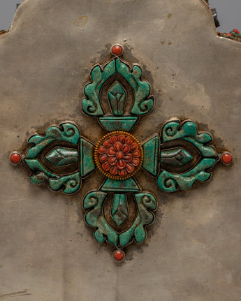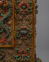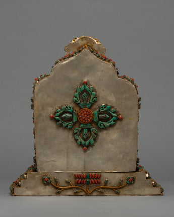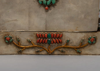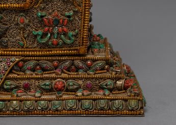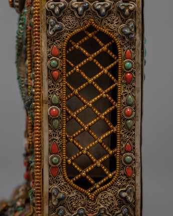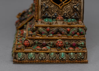 The Statue Crafted Ghau Box is an amazing artwork with a copper body and an auspicious symbol crafted on the outside of the box. The embedded gemstones add an extra layer of beauty and spiritual significance to the piece, enhancing the symbol even more. The box also has a door that is used during prayer to open the box and reveal the sacred statue inside. The box's intricate craftsmanship and meaningful symbol make it an essential item for Tibetan Buddhists, as it is frequently used to hold sacred objects and amulets. The statue inside the box is thought to provide protection and blessings to the devotee who carries it, thus making it useful.