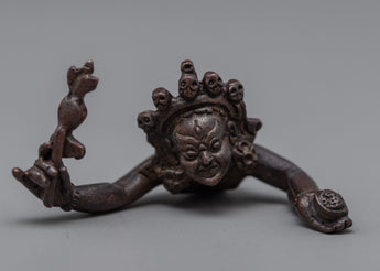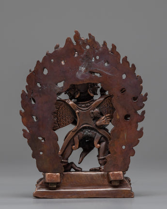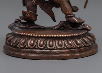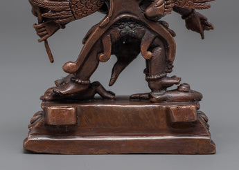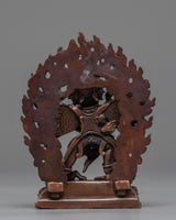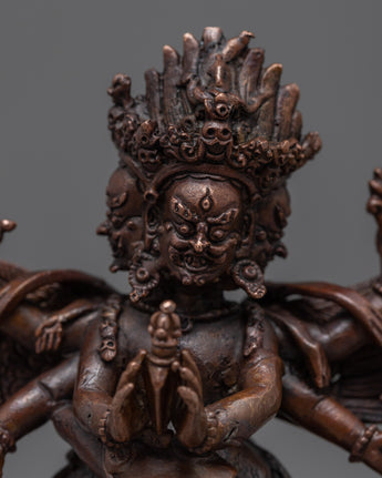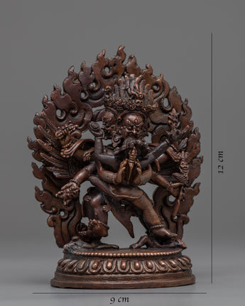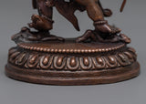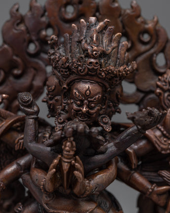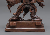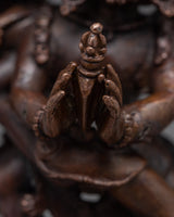 With the help of the machine, we produced this fascinating Statue for Vajrakilaya Puja. The god is pictured here with his consort, Khorlo Gyedunma. It is made up of 3 heads and 6 arms. He holds the three-bladed phurba dagger in his two hands, which is magical. One of the three main barriers to spiritual consciousness is removed by the three blades of the Phurba dagger. The body of the figure was made of molded oxidized copper. Thanks to its antique finish, this piece of art has an alluring appearance.