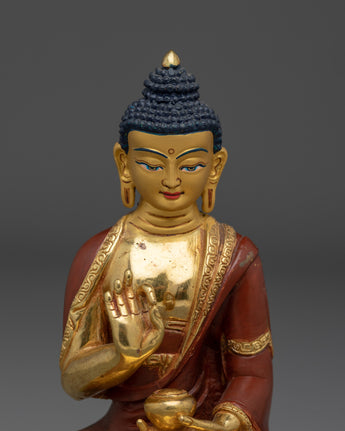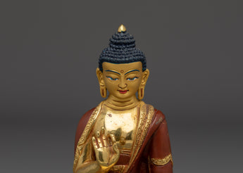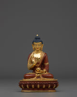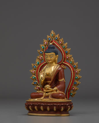 The statue's holy presence is enhanced by its gold-plated copper body, and the vivid gemstones embellishing the halo signify the Buddha's five wisdoms. The intricately crafted lotus base symbolizes purity, while the red and green accents represent balance and harmony. This Amoghasiddhi Buddha statue is a valuable addition to any altar, meditation place, or home shrine, representing achievement, overcoming obstacles, and spiritual fulfillment.