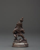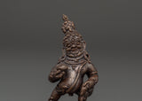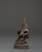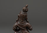 This Statue of Black Dzambhala, a powerful deity in Tibetan Buddhism, is well-known for conquering negative energies and eradicating poverty, bringing fierce protection and fortune. Standing 9cm tall and 5cm broad, this beautifully sculpted statue is created from oxidized copper. Black Dzambhala is shown in a wrathful shape, towering above a submissive figure, representing victory over greed and obstacles to success. This sculpture is suitable for individuals who perform Vajrayana, money rituals, or as a symbolic figure on their altar.