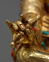 Renowned for his astounding lotus birth, Padmasambhava introduced Buddhism to Tibet and established the groundwork for its eventual translocation across the Himalayas. This statue portrays him in all his majestic grace, holding the vajra, symbolizing his unyielding compassion and wisdom, and the skull cup, filled with the nectar of blissful realization. The intricate details, from his serene expression to the symbolic ornaments, reflect the deep reverence and skilled craftsmanship that bring his presence to life.