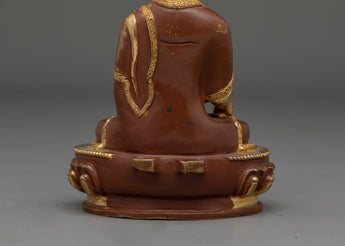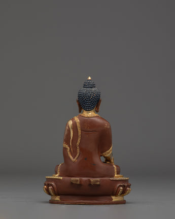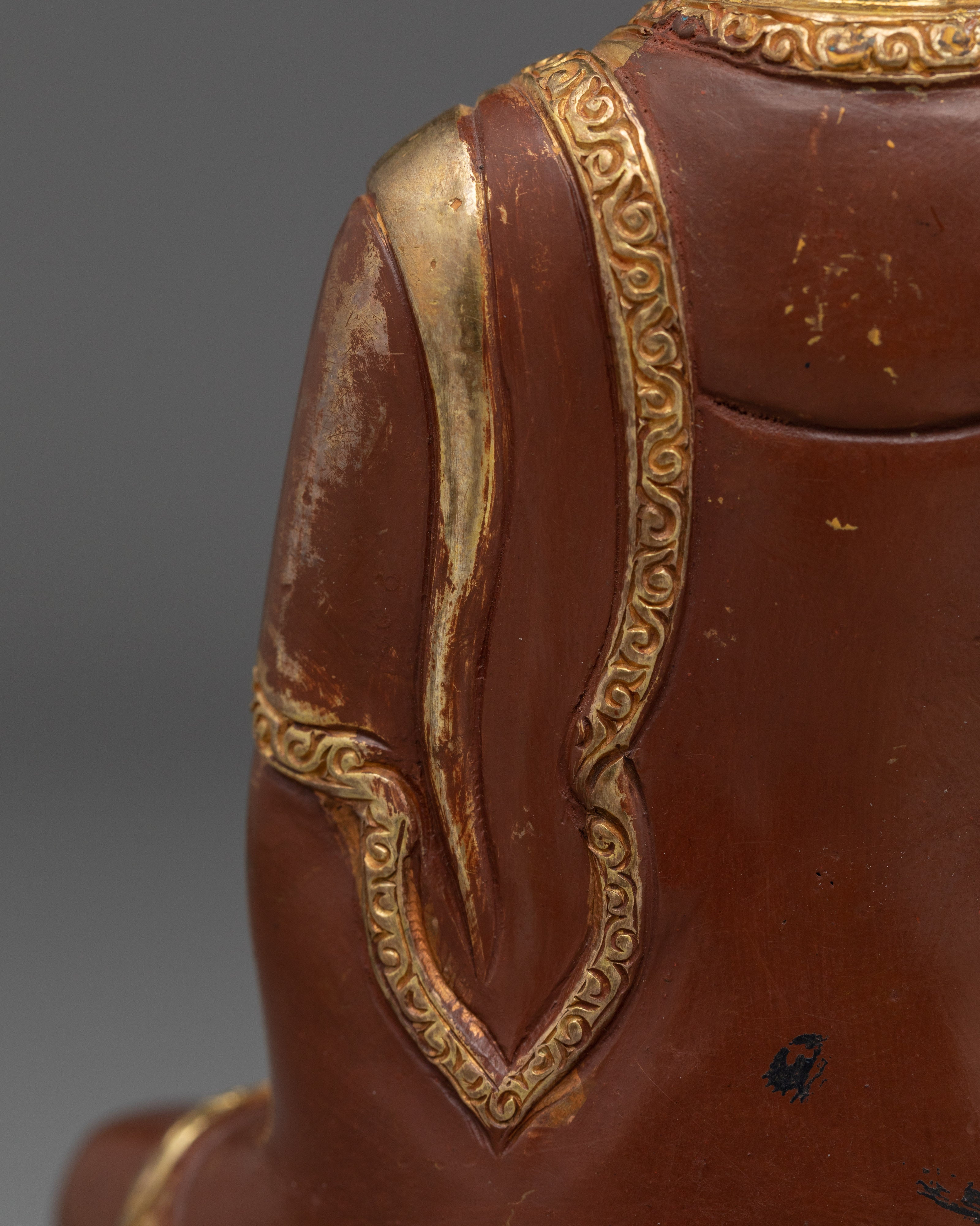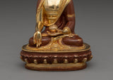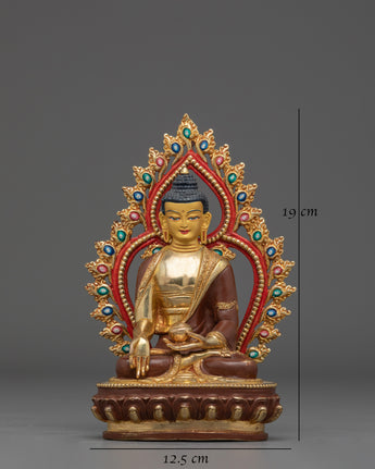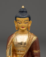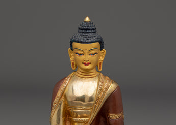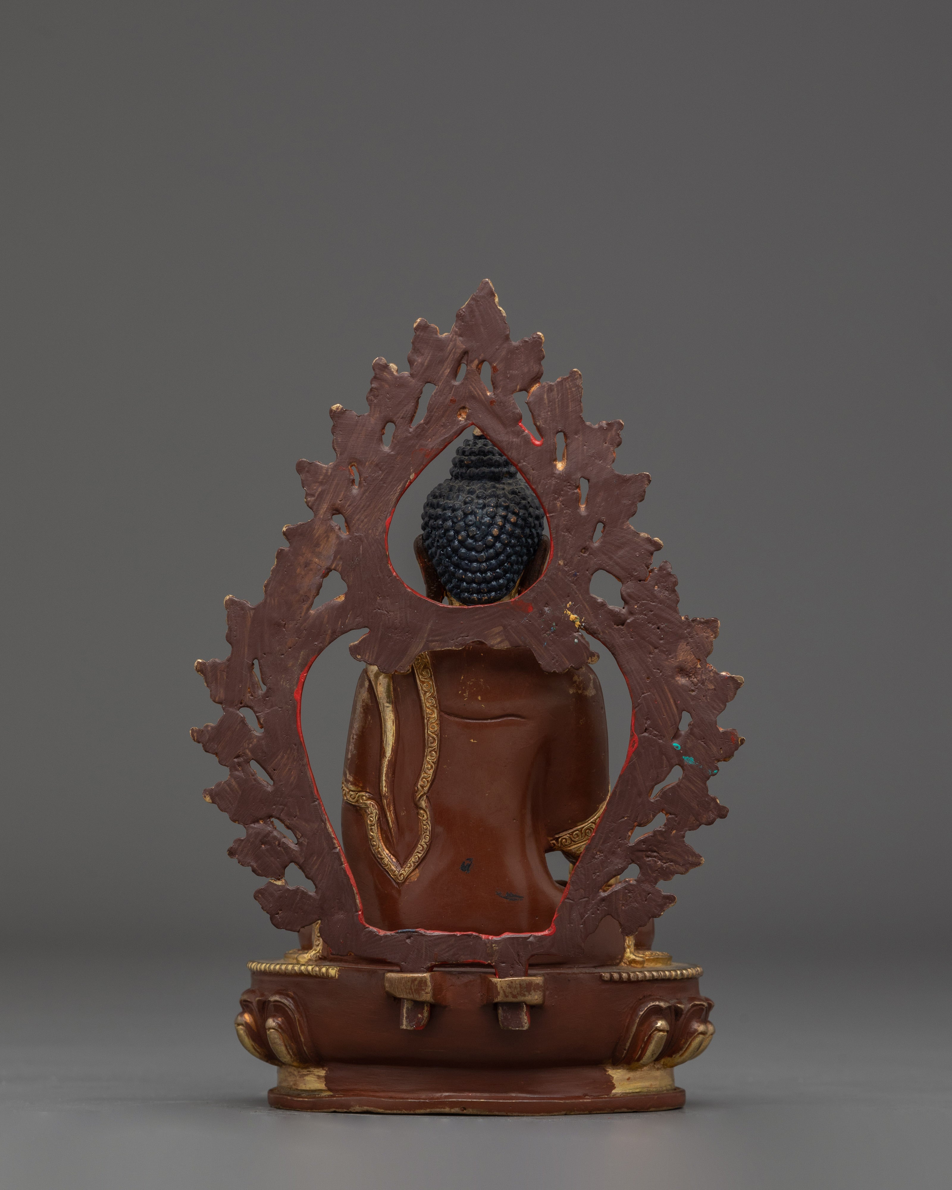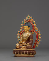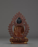 The exquisite gold-plated copper body and gemstones surrounding the halo enhance the symbolism of Ratnasambhava's qualities—the golden color represents the purity of wisdom. At the same time, the ornate embellishments and gems signify the blessings he bestows upon his followers. This Buddha statue is an excellent centerpiece for meditation rooms, shrines, and spiritual spaces, reminding practitioners of the values of compassion, kindness, and wisdom.